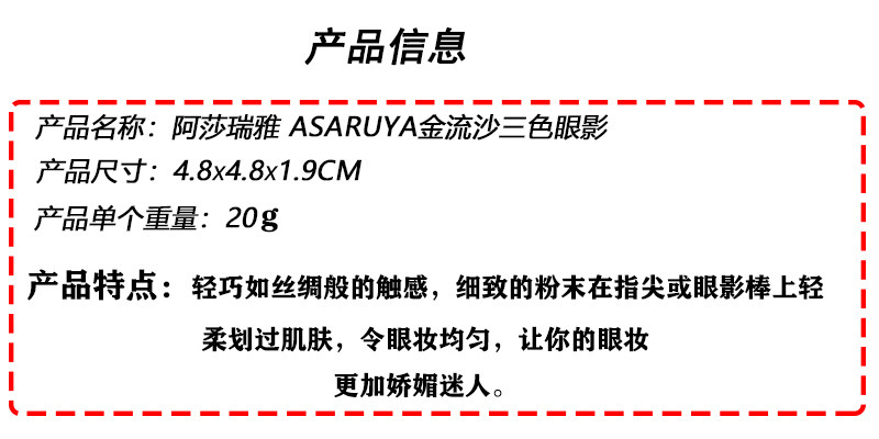 $1660| Brand Type : domestic brand,No,Asha Reya ASARUYA,Tricolor,Normal Specifications,No,Zhejiang makeup 20200047,1709,General,China,3 years,1# petrel lemon,#2 Girl Next Door,3# temperament golden brown,4# flowing cloud magic color,5# Dancing Elf,6# Classic Earth,7# color dance,ebay,Amazon,wish,AliExpress,Independent Station,LAZADA,Yes,Yes,Zhejiang G makeup net preparation word 2023004801,Girls/Students,White,Pink,Purple,Brown,Blue,Eyeshadow,Pearlescent,Mashed potatoes,Fine flash,general population,Asha Reya ASARUYA gold quicksand tricolor eye shadow |